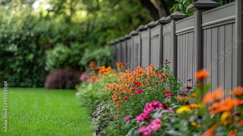 A backyard scene featuring a prefab concrete fence with decorative caps, surrounded by colorful flowers.