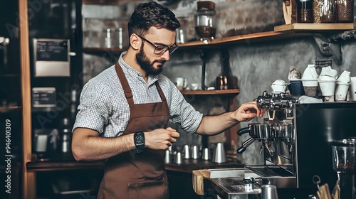 barista, hot drink, espresso, machine, cafes, man, apron, work, eatery, drink, food, beverage, business, service, professional, young, male, adult, caucasian, goggles, beard, watch, shirt, brown, white, silver, black, counter, background, interior, shelf, kitchen, cup, water, hot, pouring, steam, foam, preparation, brewing