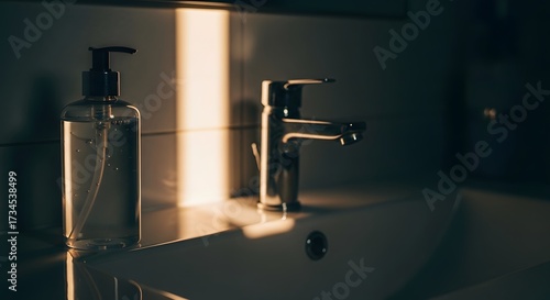 A bathroom sink with a soap dispenser and faucet, illuminated by a beam of sunlight creating strong shadows.
