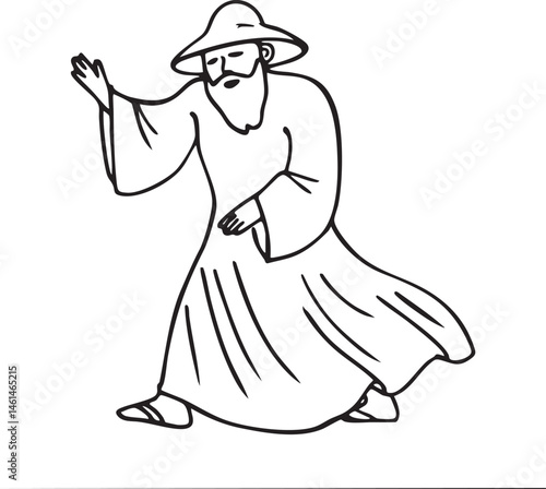 man, figure, gesture, hat, robe, hand, movement, silhouette, black, white, drawing, expression, drama, isolated, solitary, contemplation, peaceful, calm, serene, quiet, stillness, thought, spirituality, wisdom, elderly, old, ancient, culture, tradition, character, pose, form, shape, texture, artistic