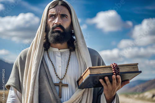 A bearded man with long hair and a cross around his neck, holding a book with red beads