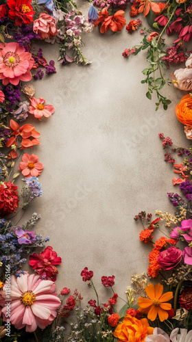 A beautiful arrangement of colorful flowers framing a blank space, ideal for invitations or greeting cards.