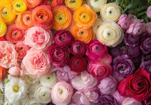 A Beautiful Arrangement of Colorful Ranunculus Flowers in Various Shades, Creating a Lush Floral Background for Spring and Summer Decorations and Events