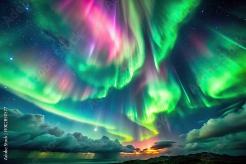 A beautiful background of green clouds and pink aurora lights from a high angle view