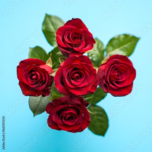 A beautiful bouquet of five deep red roses with green leaves against a bright blue background