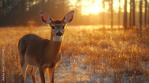 animal, wildlife, cervid, nature, field, grass, sunlight, sunset, forest, tree, ear, eye, fur, brown, warm, gold, light, morning, dawn, evening, landscape, outdoors, serene, peaceful, calm, beauty, sharpened, isolated, portrait, head, body, mammal, fauna, environment, habitat, background, natural, delicate, bright, sun, season, winter, view, closeup, wild, creature, graceful, facing