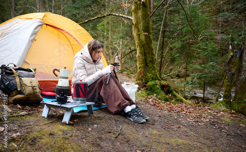 beautiful, girl, tent, forest, film, smartphone, camera, travel, female, social, video, story, camping, adventure, tour tourism, content, creator, recording, hiking, nature, wilderness, exploration, campground, lifestyle, mobile, device, technology, storytelling, selfie, journey, scenic, relaxation, backpacking, expedition, freedom, leisure, cosy, remote, wood, mountain, communication, engagement, filming, solitude, connection