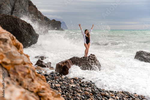 A beautiful girl in a white shirt and black swimsuit stands on a rock, big waves with white foam. A cloudy stormy day at sea, with clouds and big waves hitting the rocks.