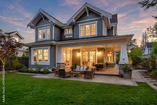 A beautiful home exterior at dusk with a front porch and patio lights on, a green grass lawn in the backyard of a luxury Craftsman-style house with white trim and grey shingle walls.