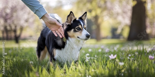 A beautiful scene of human-animal connection unfolds in a lush spring meadow. A person's hand gently pets a tri-colored dog amidst blooming flowers and a backdrop of a blossoming tree.