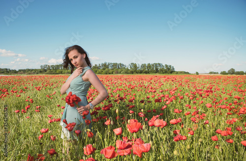 A beautiful, slender girl in a short turquoise dress against the background of a poppy field in the rays of the setting sun