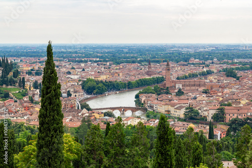 panoramic view, verona, from above, rooftop, church, cathedral, della, the blessed virgin mary, lourdes, infused, hill, top, summer, cloudy, etch, river, building, colourful, high-coloured, tour tourism, travel, italian, landmark