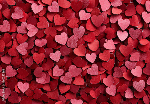 A beautiful top down view of countless red and pink hearts creates a romantic and loving arrangement.