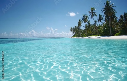 A beautiful tropical beach with white sand, palm trees, and clear blue water