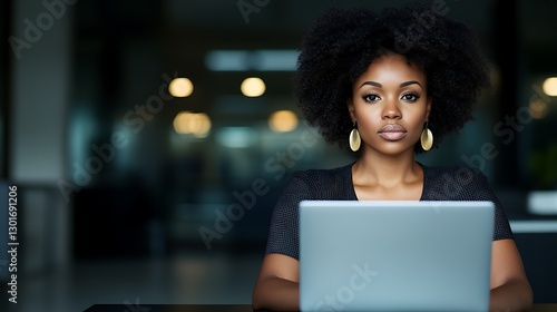 woman, laptop, computer, work, office, business, professional, portrait, afro, hair, earring, face, skin, eye, gaze, serious, focused, desk, table, dark, background, blurred, light, gold, confident, elegant, style, attire, clothing, closeup, black, natural, make-up, beauty, looking, person, female, digital, modern, technology, screen, employee, front, view, sitting, arm, pose, indoor