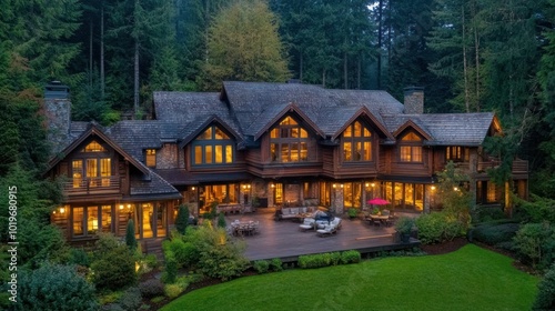 A beautiful wooden house surrounded by lush trees, illuminated at dusk.