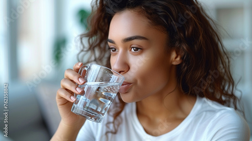 A beautiful young African American woman in white shirt is drinking a glass cup of water in the morning, on blurred white modern home background, healthy life style concept, with copy space.