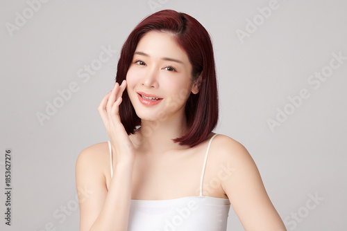 A beautiful young Asian woman with clean, fresh skin against a grey background. Skincare, facial treatment, cosmetology, beauty, and spa. An elegant portrait of an Asian woman.