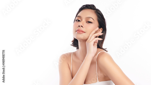 A beautiful young Asian woman with clean, fresh skin against a white background. Skincare, facial treatment, cosmetology, beauty, and spa. An elegant portrait of an Asian woman.