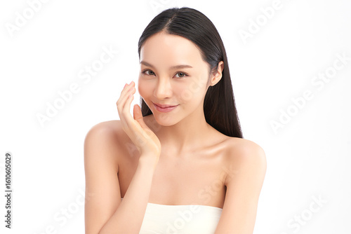 A beautiful young Asian woman with clean, fresh skin against a white background. Skincare, facial treatment, cosmetology, beauty, and spa. An elegant portrait of an Asian woman.