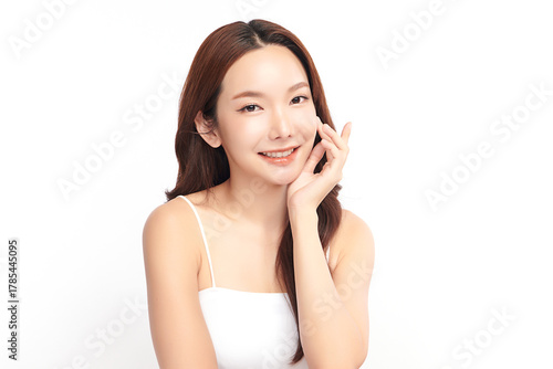 A beautiful young Asian woman with clean, fresh skin against a white background. Skincare, facial treatment, cosmetology, beauty, and spa. An elegant portrait of an Asian woman.