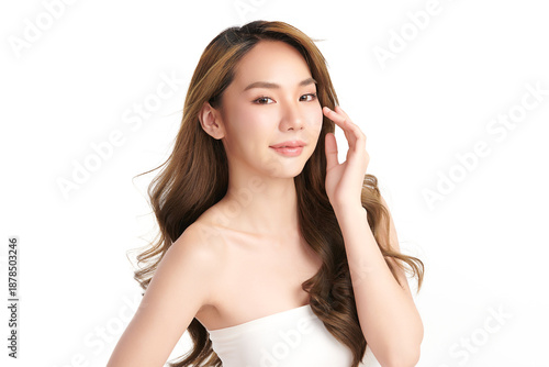 A beautiful young Asian woman with clean, fresh skin against a white background. Skincare, facial treatment, cosmetology, beauty, and spa. An elegant portrait of an Asian woman.