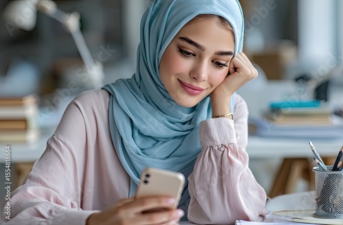 A beautiful young Muslim woman in a blue and pink hijab sits at a table, holding a Phone with her right hand and thoughtfully touching its screen with her finger