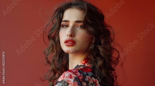 A beautiful young woman with wonderfully hair and traditional makeup. An advertising photo on a uniform colored background.