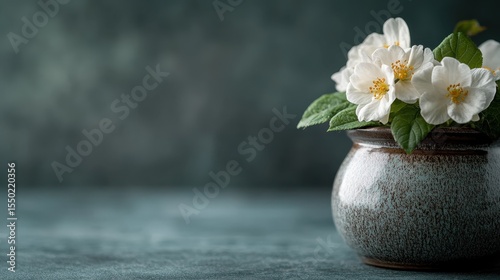 A beautifully arranged bunch of white flowers in a rustic pot, exuding elegance and simplicity, perfect for adding a touch of natural beauty to any space.