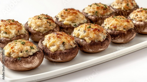 A beautifully arranged platter of stuffed mushroom caps filled with a creamy cheese and herb mixture