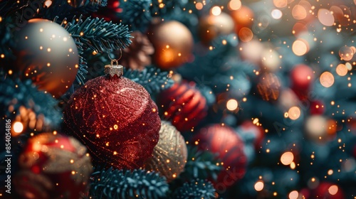 A beautifully decorated Christmas tree with an abundance of red and gold ornaments, surrounded by a warm, glowing ambiance.
