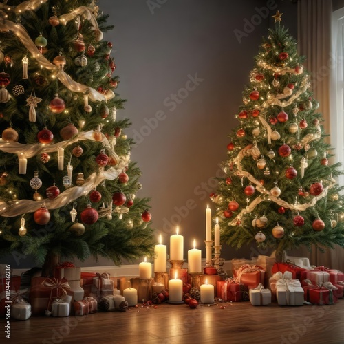 A beautifully decorated Christmas tree with candles, ornaments, and garlands, winter decorations, Christmas ambiance , garlands