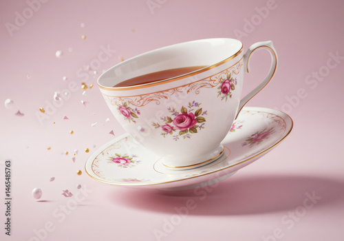 teacup, tea, cup, saucer, floral, rose, pink, delicate, porcelain, levitation, floating, elegant, gold, ornate, vintage, classic, afternoon tea, tea-party, still life, drink, beverage, tableware, china, white, background, pretty, aesthetic, refined, luxury, decoration, romantic, celebration, party, fragile, graceful, beautiful, retro, closeup, studio shot, isolated, light, shadow, design, pattern, art, craft, style