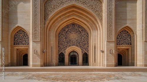 A beautifully designed mosque entrance with intricate Islamic patterns, welcoming people for Eid prayers.