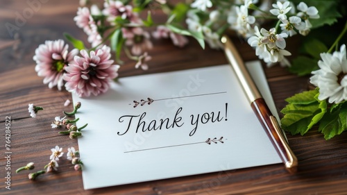a beautifully handwritten Thank you on a white card, adorned with a bouquet of vibrant flowers and a pen, set against a wooden backdrop.