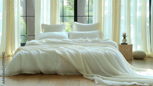 a bed with a white comforter and pillows in front of a window with sheer curtains and a potted plant.