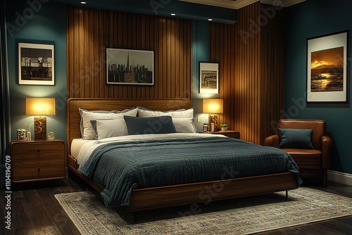 bedchamber, large, bed, chair, nightstand, blue, comforter, room, pillow, sophisticated, interior, modern, experiencing, apartment, design, home, wall, furniture, house, floor, decor, hotel, luxury, white, architecture, window, sleep, style, contemporary, light, lamp, living, beautiful, relaxation, clean, wood, blanket, residential, elegance, empty, headboard, stylish, three-dimensional, rest, inside, indoor, carpet, table