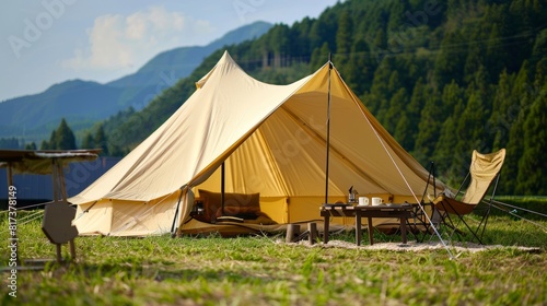 A beige canvas tent set up on the grass, with outdoor camping equipment such as folding chairs