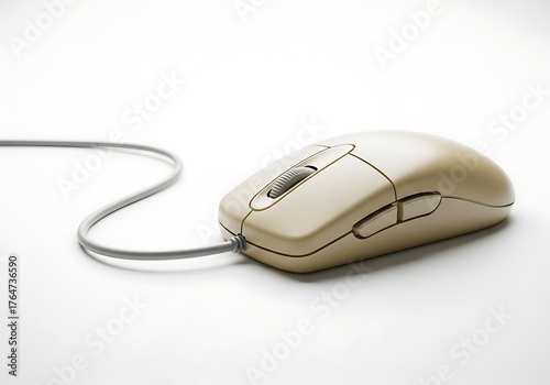 A beige computer mouse with a gray cord isolated on a white background