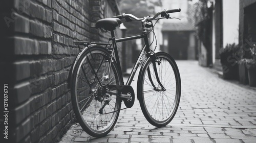 A bicycle rests against a weathered brick wall in a narrow alley, showcasing urban charm and simplicity in a secluded setting.