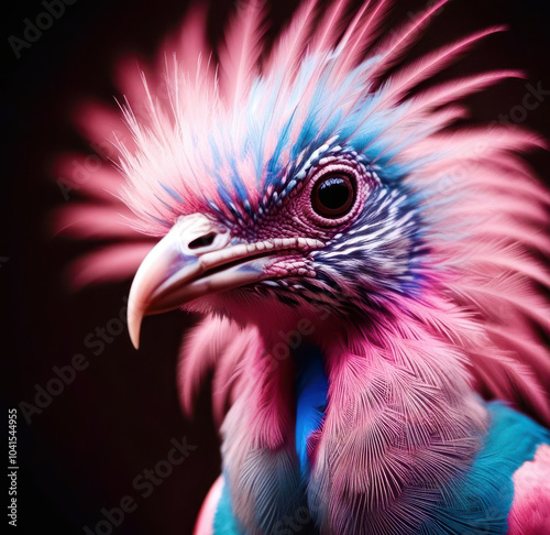 A bird with pink and blue feathers on its head