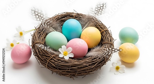 A bird's nest filled with colorful Easter eggs and surrounded by flowers on a white background