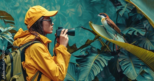 birdwatcher, binocular, standing, observing, wildlife, outdoors, hobby, ornithology, enthusiast, activity, discovery, exploration, environment, birding, forest, tree, bush, plant, leaf, wing, feather, flying, identifying, research, study, adventurer, explore, adventure, leisure, avian, hobbyist, equipment, optic, birdlife, discovering, ecology, fauna, wild, conservation, education, learning, scientist, hat, woman