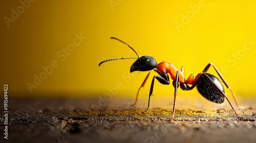 A black and orange ant is standing on a yellow surface. The ant is looking up at the camera