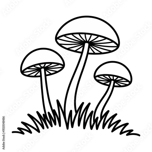 A black and white illustration of three mushrooms growing in the grass isolated on transparent background