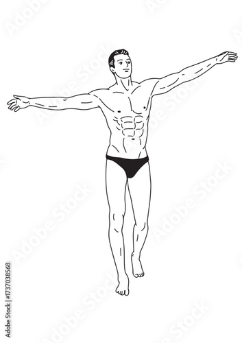 A black and white linear illustration A young man happily walks around in his swimming trunks, showing off his beautiful muscles.