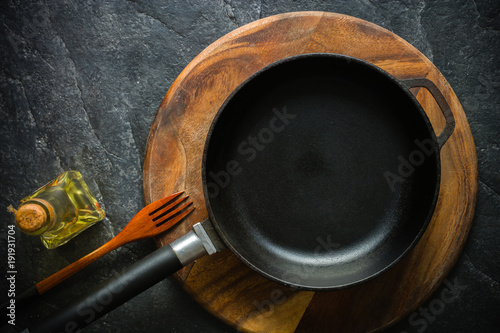 A black cast-iron frying pan for cooking food. Vegetable oil with spices.