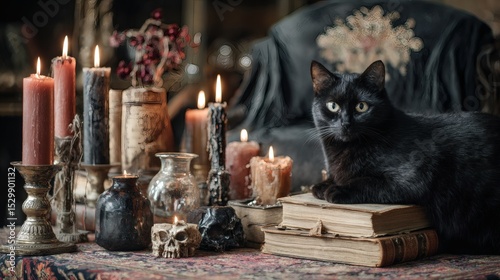 A black cat rests atop aged books, amidst lit candles, glass vases, and skull statuettes. A vintage setting with a touch of mystery and elegance.