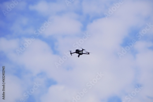 drone, flying, sky, cloud, technology, aerial, aircraft, unmanned, vehicle, rotorcraft, modern, nature, blue, white, movement, freedom, exploration, surveillance, photo, videography, hobby, leisure, innovation, future, engineering, aviation, transport, communication, remote, control, device, machine, propeller, wing, airborne, high, altitude, atmosphere, weather, day, sunlight, bright, clear, distant, view, perspective, travel