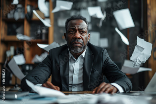 frustration, paperwork, upset, document, paper, unhappy, stress, sleepy, sad, problem, workplace, tied-up, manager, document, flying, working, job, stack, deadline, desk, chaos, overworked, bored, exhaustion, burnout, office, multitask, overload, overwhelmed, workload, bad, work, stuck, overtime, business, concept, black, man, dissatisfied, african american